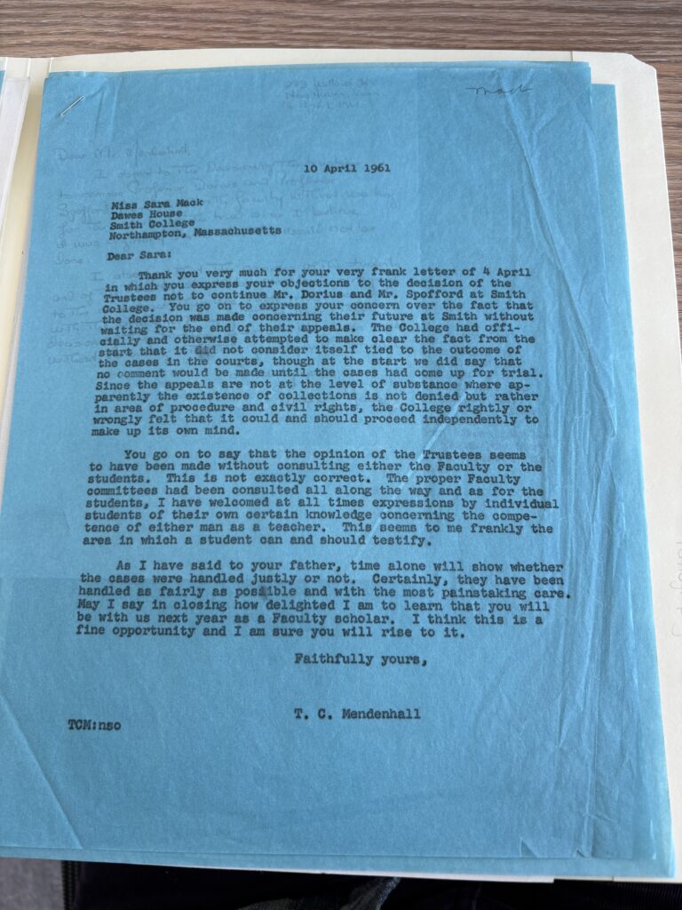 During the fallout, the then president of Smith College, Thomas C. Mendenhall had to field a barrage of letters from students, faculty, and the board of trustees. Each, individually, had a different idea of the just and humane way to handle the scandal, whether to prioritize the welfare of the college’s reputation or the welfare of the men at the center of “the Affair”. Across the spring semester, the Trustees met and discussed the decision of what to do with Dorius and Spofford, already having decided to retire Arvin, to which he made little protest, but implored in a letter to Mendenhall on September 29, 1960: