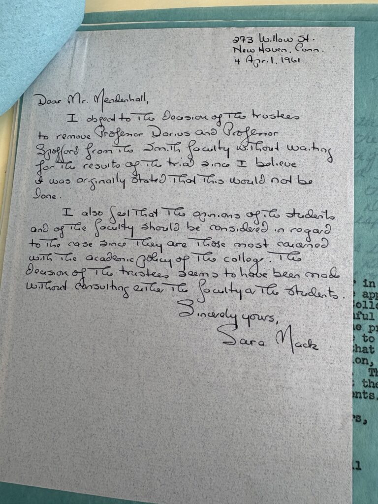It seemed Arvin was aware that, while his trial might have been finished, there was an immediate importance for Spofford, Dorius, and every persecuted person not to lose hope. Nevertheless, the “statement to the faculty” on February 22, 1961, also included informing the editor of the Sophian, Smith College’s newspaper, who would announce the Trustees’ decision not to reappoint Dorius and Spofford to the school as a whole. After the announcement of the Trustees’ decision, many students wrote to express their dissatisfaction and The Sophian ran a letter signed by 16 students titled “We Accuse” stating: