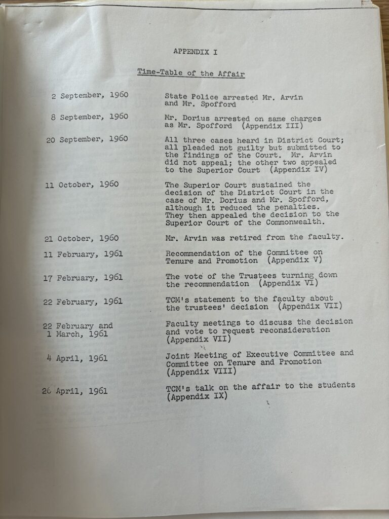 Appendix I for Smith College Trustee Meeting, 1961, Smith College Archives concerning Newton Arvin, Smith College Archive.