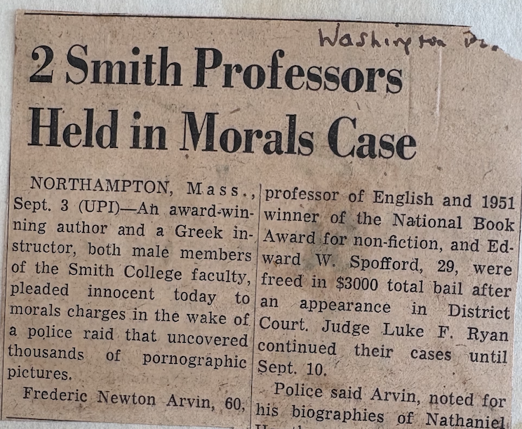 Unattributed News Clipping, “Four Are Fined in Morals Probe at Northampton,” Smith College Archives collection regarding Newton Arvin, Smith College Archive, Box 665, Folder 21. ↩︎