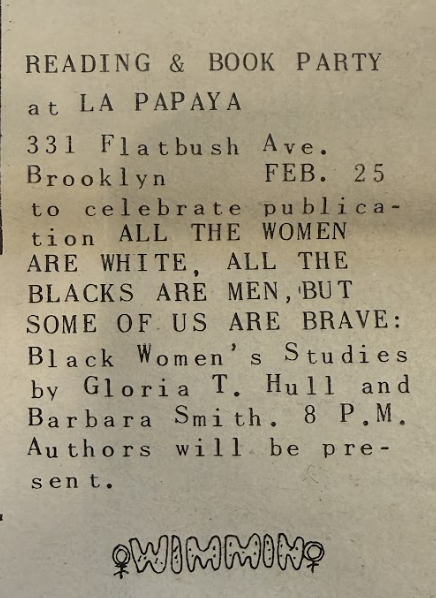 This event is a shining example of Black lesbians creating space for kinship and a celebration of Black feminist praxis. The book, All the Women Are White, All the Blacks Are Men, But Some of Us Are Brave: Black Women’s Studies by Akasha Gloria Hull, Barbara Smith, and Patricia Bell-Scott is one of the most influential Black feminist anthologies ever published. As a co-founder of the Kitchen Table Press, which moved operations to New York in 1981, Barbara Smith was an important figure in the social and political movements of Black women in Brooklyn at the time. La Papaya not only creating a space to celebrate the publication of a key Black feminist text, but also inviting Hull and Smith to personally present their book at this event, displays their active inclusion of Black lesbians in the broader women’s movement.