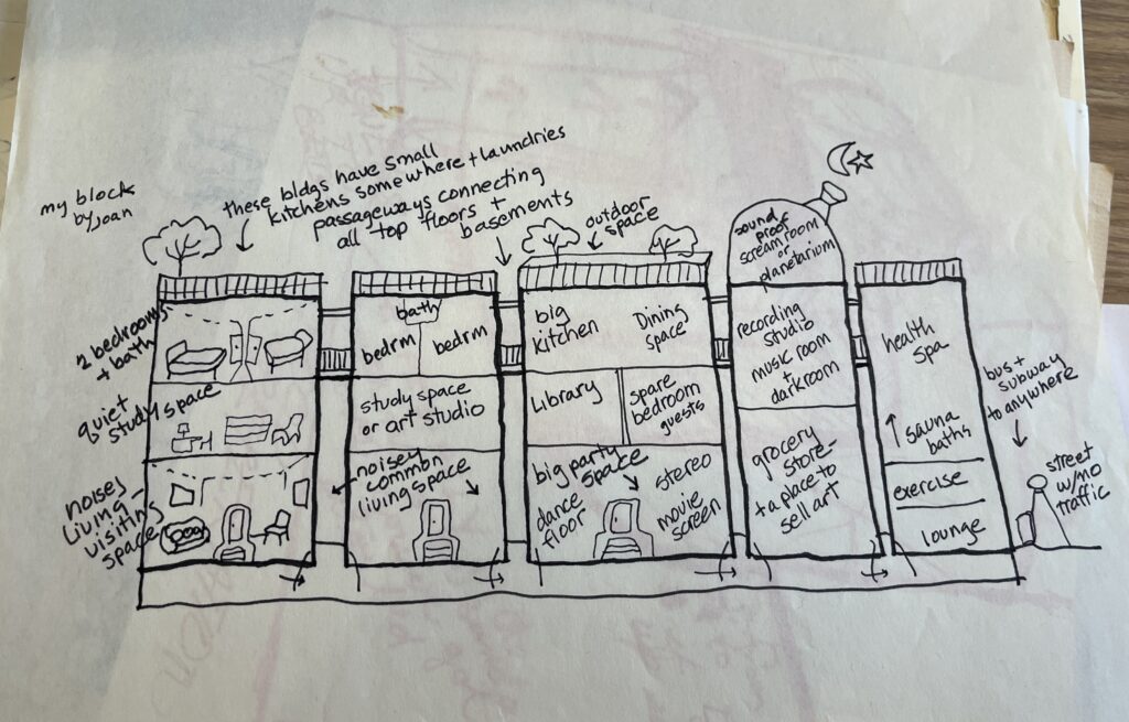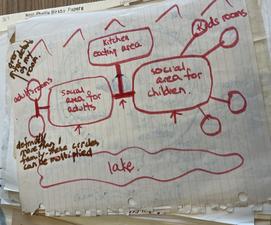 Based on the archival drawings from the Phyllis Birkby papers within the Sophia Smith Collection, participants in the “Women and the Built Environment” workshops had been thinking about what communal living spaces could look like and how they would function.5 A large number of the saved drawings feature separated areas for housework, hosting, and resting.