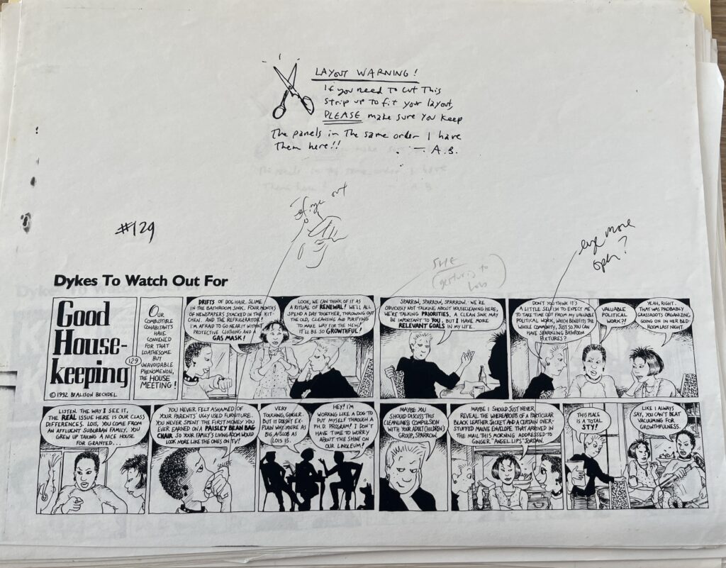 In her 1983-2008 comic series, Dykes to Watch Out For (DtWOF), cartoonist Alison Bechdel develops a realistic lesbian community whose interpersonal struggles and reactions to important events form the plot of her serials turned novels.1