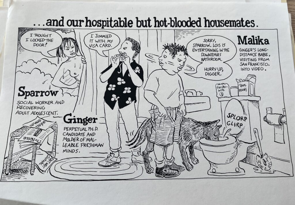 Bechdel’s strips find humor in the dynamics between housemates and the conflicts that arise from living in close proximity. This particular strip, re-introducing some of the house residents, highlights the problems created by the spatial layout of the home. Since there are only two bathrooms in the house, Ginger and Lois’ new partner, Malika, have to invade Sparrow’s (and each others’) privacy in order to complete their daily routines.