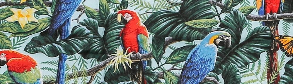 After taking a sewing workshop I felt all the scrap pieces of fabric, buttons, zippers, and pins needed a place to shine. This is the set of the first draft of this piece, and what feels important to me is this couch. I can see it symbolizing so much of who I am, what my work is, and what it can be. I keep discovering ways in which it feeds me and I hope I can replicate it and bring it to the stage. Most intriguing is the fabric in the middle, a tropical drawing of parrots and palm trees which is the featured image for this page.