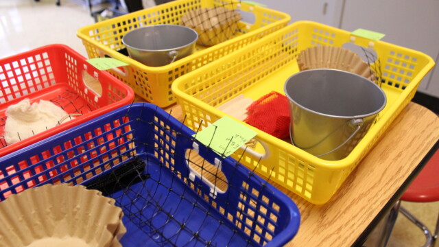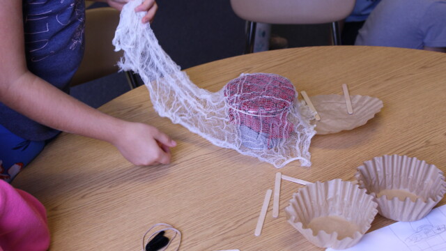 After sketching “blueprints” for storm drains better designed to “solve problems”– to keep water from flooding the streets; prevent litter from entering the water; and, most resonantly, save future ducklings from falling into their depths– students arrived in Jan and Ruth’s classroom to find a table of materials waiting for them. Small metal buckets, cheesecloth, red mesh, black wire, rubber bands, coffee filters, and Popsicle sticks were among the supplies divided into kits for each table-group.