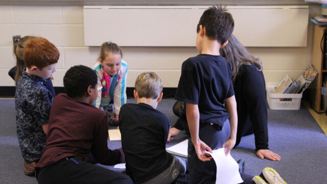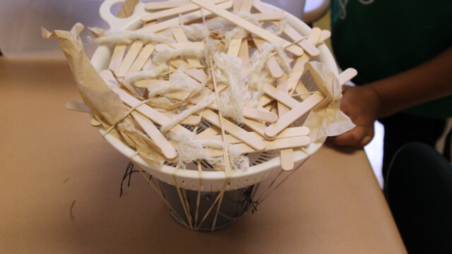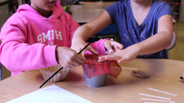 Back on their classroom rug, Ruth guided students through a discussion about what worked in their drain designs, and what they would choose to do differently next time around. “Ours withstands environmental materials,” a student shared with pride. “We learned how to connect our materials with rubber bands instead of just balancing materials on top of each other. We weaved Popsicle sticks to [secure] them, too,” a neighboring group added.