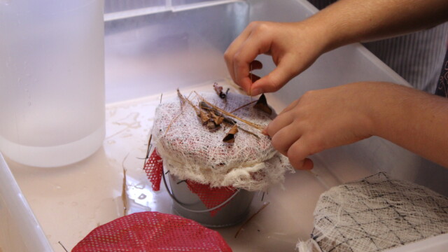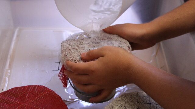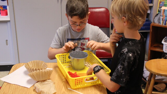 “How” and “Why” questions filled the room as students set to work on their drain designs, explaining and modifying their ideas with their table-mates. Some students placed layers of coffee filters in their drain buckets, while others made “trampolines” with rubber bands and Popsicle sticks. Once they finished their prototypes, Ruth helped them test their ideas, first placing a rubber duckling on the top of their drain; then natural materials (pine needles, crunchy leaves); and, finally, “rain” poured from a pitcher of water. Students huddled over their designs, closely examining the successes and challenges of their prototypes in action.