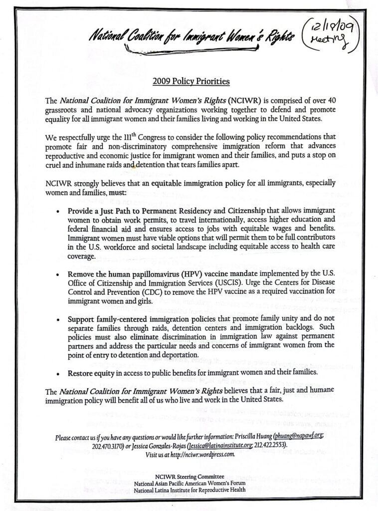 Estoy reforzando este punto haciendo una exploración histórica de algunos de los primeros grupos que primero incluyeron a las personas inmigrantes como un grupo vulnerable importante y incluir. Esto se puede ver en los carteles de archivo que obtuve de la Colección Sophia Smith de Historia de la Mujer en la colección de Archivos de Smith College. A principios de los años dos mil, el Instituto Nacional Latino para la Salud Reproductiva destacó las tasas desproporcionadamente bajas de aprendizaje educativo que tenían las personas inmigrantes sobre la curación de EE. UU. en uno de sus folletos. Además, en dos mil diez la Coalición Nacional por los Derechos de la Mujer Inmigrante destacó el valor económico que ofrecían las mujeres inmigrantes, además de enfrentarse a críticas discriminatoriamente altas de discriminación sexual y por embarazo.