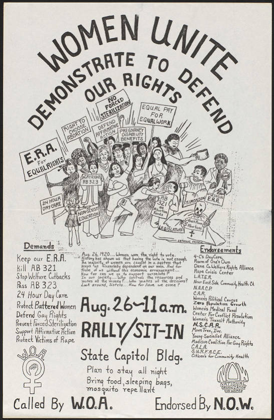Women Organize for Action (W.O.A.). Women Unite: Demonstrate to Defend Our Rights (rally flyer). ca. 1970s. National Organization for Women (NOW) endorsement. Sophia Smith Collection, Smith College Special Collections.