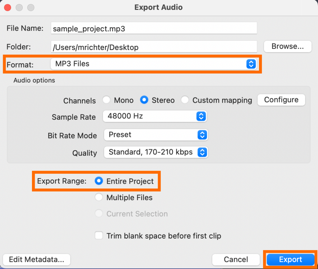 To export your project as a .mp3 file, you will need to choose File → Export Audio… → Export to computer. Then you can change the file name, destination, and file format (mp3), making sure to select the Export Range as Entire Project, and finally choose Export.