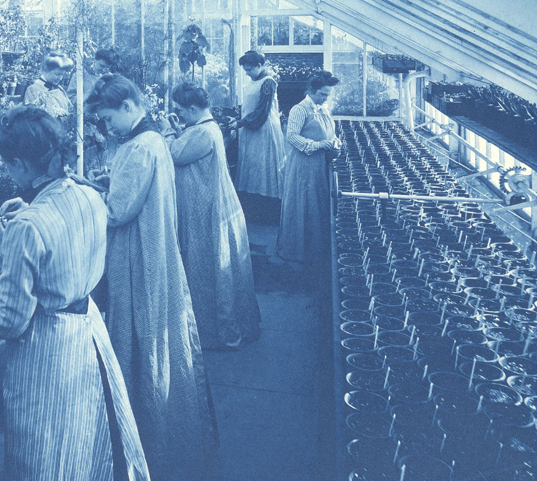 “Edward J. Canning, Head Gardner, with students in Lyman Plant house, Smith College, 1903-04,” photographer unknown.