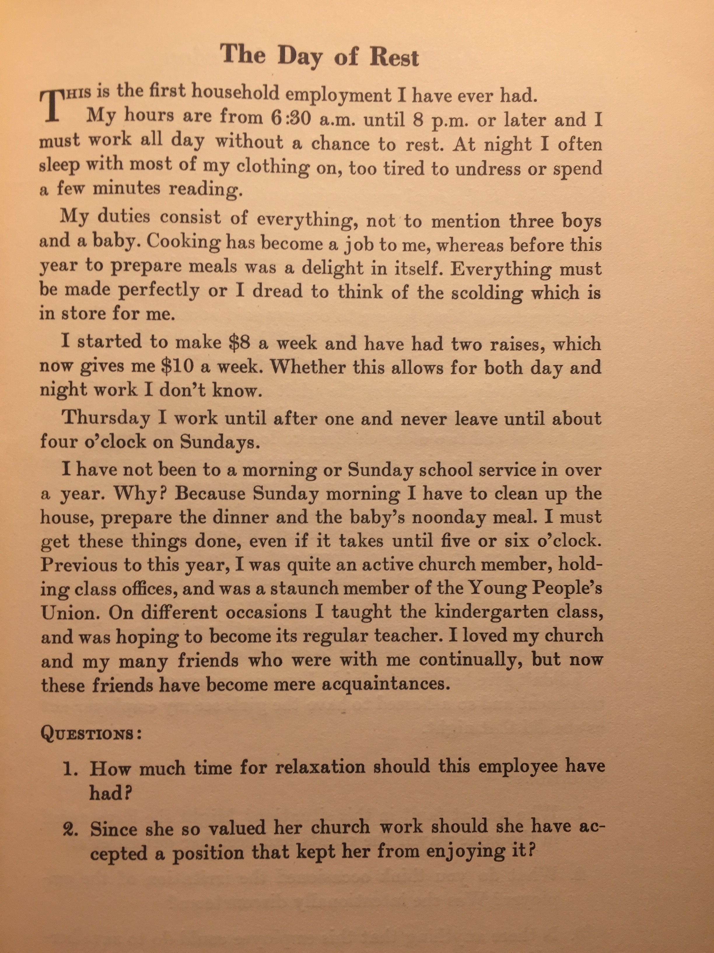 For this section I have selected documents found in the SSC that can help to show us what the SSC collection holds. The first document is a mock contract, written by the Indiana Subcommittee. The document is titled “Suggested Standards for Household Employment”. The second document is a publication from the Subcommittee on Household Employment of Pennsylvania, that addresses employers, asking them questions about how they are treating their employees. The final two images are selected from the book in the fourth photo, a publication from the Chicago Subcommittee. While the YWCA records hold a vast variety of different documents, these documents show the connection to employers that the YWCA worked to foster. While all of these documents help employers to treat their employees better, they put the focus on the employers.