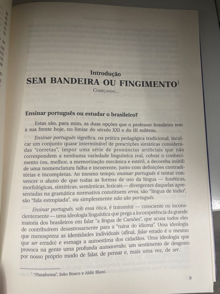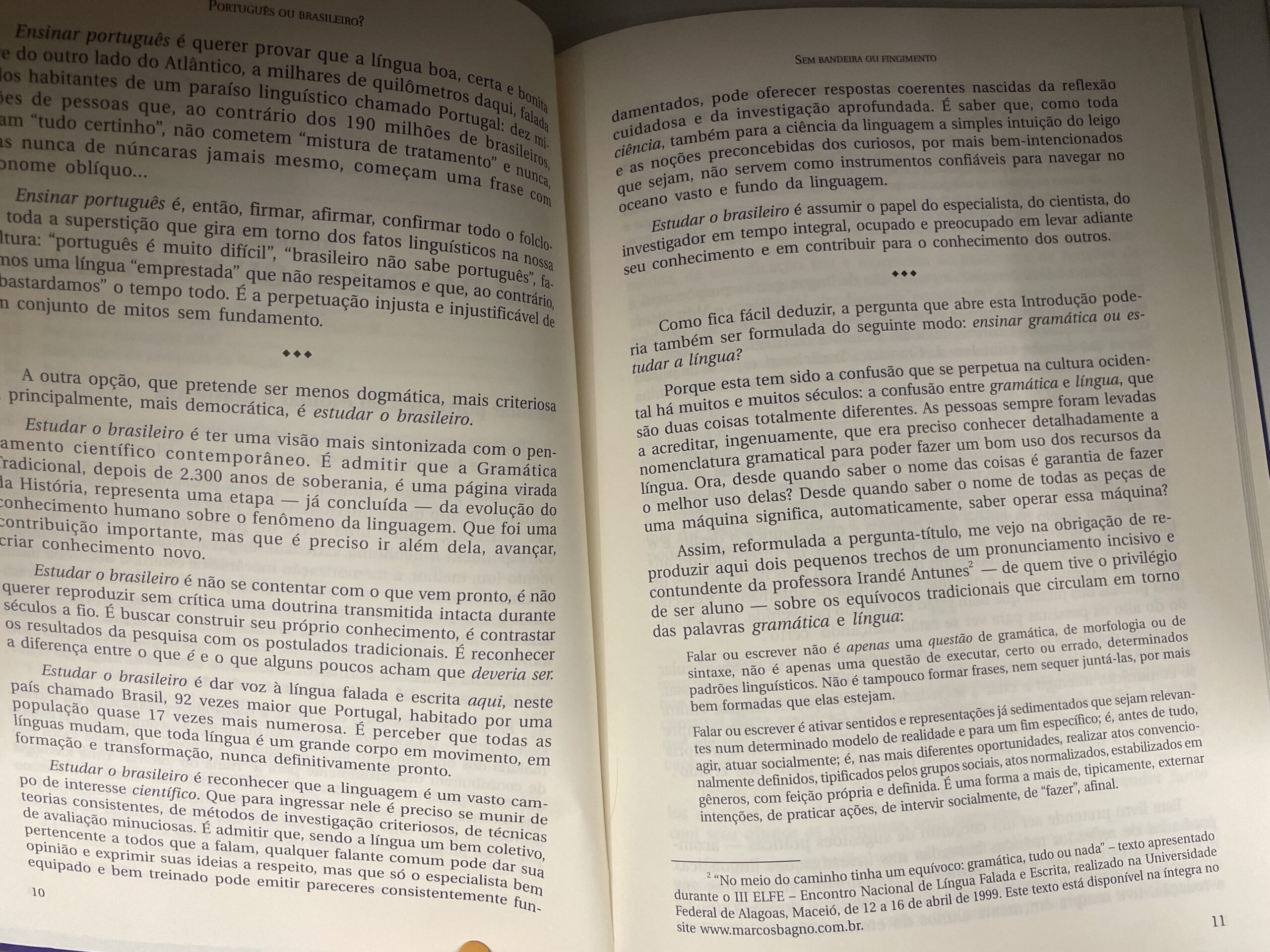 The first book I recommend is Portugués ou Brasileiro? by Marcos Bagno. This text explores the pedagogical differences between teaching Portuguese and teaching “Brazilian”. In the introduction, Bagno invites us to understand the difference between learning strict grammar and pronunciation rules to adhere to traditional language-learning practices and learning Portuguese as a holistic practice that incorporates the ever-changing aspects of this diverse language.