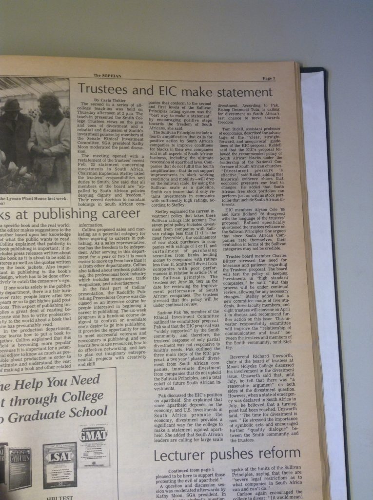 (De)segregation 1957 1958 1961 1963 1965 1966 1967 1968 1969 1970 1972 1986 1988 1989 1990 1994 1995 1996 2002 2012 2014 Abroad Affirmative Action Apartheid in South Africa Asian Students’ Association (ASA) Black Students Black Students' Alliance (BSA) Civil Rights Committee on Community Policy (CCP) Concerned Students of All Colors (CSAC) Hate Incident Institutional Action Institutional Discourse International Students International Students’ Organization (ISO) Korean American Students of Smith (KASS) Nosotras [LASO] Smith African Students’ Association (SASA) South Asian Students' Association of Smith (EKTA) Student Demands Student Protests Student Voices Vietnam War Weaving Voices