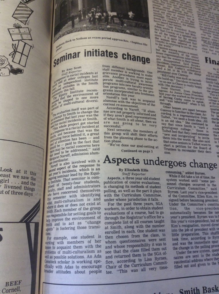 (De)segregation 1957 1958 1961 1963 1965 1966 1967 1968 1969 1970 1972 1986 1988 1989 1990 1994 1995 1996 2002 2012 2014 Abroad Affirmative Action Apartheid in South Africa Asian Students’ Association (ASA) Black Students Black Students' Alliance (BSA) Civil Rights Committee on Community Policy (CCP) Concerned Students of All Colors (CSAC) Hate Incident Institutional Action Institutional Discourse International Students International Students’ Organization (ISO) Korean American Students of Smith (KASS) Nosotras [LASO] Smith African Students’ Association (SASA) South Asian Students' Association of Smith (EKTA) Student Demands Student Protests Student Voices Vietnam War Weaving Voices