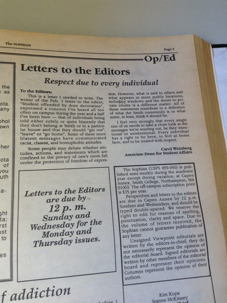 (De)segregation 1957 1958 1961 1963 1965 1966 1967 1968 1969 1970 1972 1986 1988 1989 1990 1994 1995 1996 2002 2012 2014 Abroad Affirmative Action Apartheid in South Africa Asian Students’ Association (ASA) Black Students Black Students' Alliance (BSA) Civil Rights Committee on Community Policy (CCP) Concerned Students of All Colors (CSAC) Hate Incident Institutional Action Institutional Discourse International Students International Students’ Organization (ISO) Korean American Students of Smith (KASS) Nosotras [LASO] Smith African Students’ Association (SASA) South Asian Students' Association of Smith (EKTA) Student Demands Student Protests Student Voices Vietnam War Weaving Voices