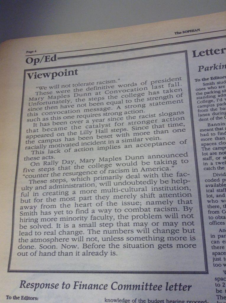 (De)segregation 1957 1958 1961 1963 1965 1966 1967 1968 1969 1970 1972 1986 1988 1989 1990 1994 1995 1996 2002 2012 2014 Abroad Affirmative Action Apartheid in South Africa Asian Students’ Association (ASA) Black Students Black Students' Alliance (BSA) Civil Rights Committee on Community Policy (CCP) Concerned Students of All Colors (CSAC) Hate Incident Institutional Action Institutional Discourse International Students International Students’ Organization (ISO) Korean American Students of Smith (KASS) Nosotras [LASO] Smith African Students’ Association (SASA) South Asian Students' Association of Smith (EKTA) Student Demands Student Protests Student Voices Vietnam War Weaving Voices