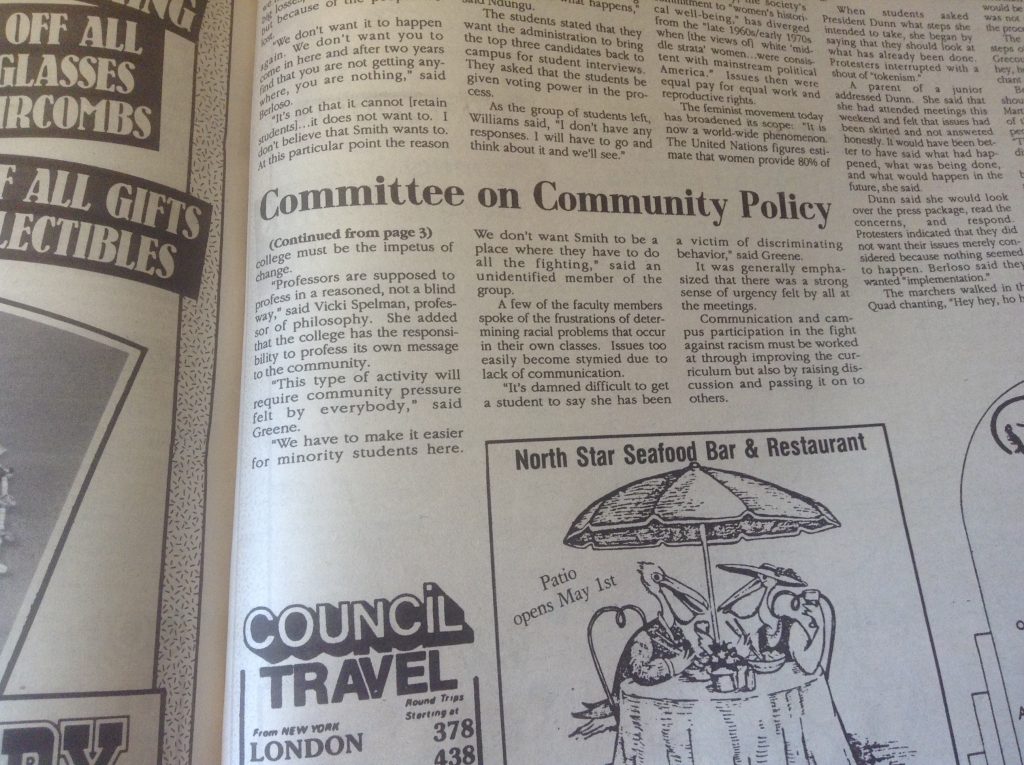 (De)segregation 1957 1958 1961 1963 1965 1966 1967 1968 1969 1970 1972 1986 1988 1989 1990 1994 1995 1996 2002 2012 2014 Abroad Affirmative Action Apartheid in South Africa Asian Students’ Association (ASA) Black Students Black Students' Alliance (BSA) Civil Rights Committee on Community Policy (CCP) Concerned Students of All Colors (CSAC) Hate Incident Institutional Action Institutional Discourse International Students International Students’ Organization (ISO) Korean American Students of Smith (KASS) Nosotras [LASO] Smith African Students’ Association (SASA) South Asian Students' Association of Smith (EKTA) Student Demands Student Protests Student Voices Vietnam War Weaving Voices