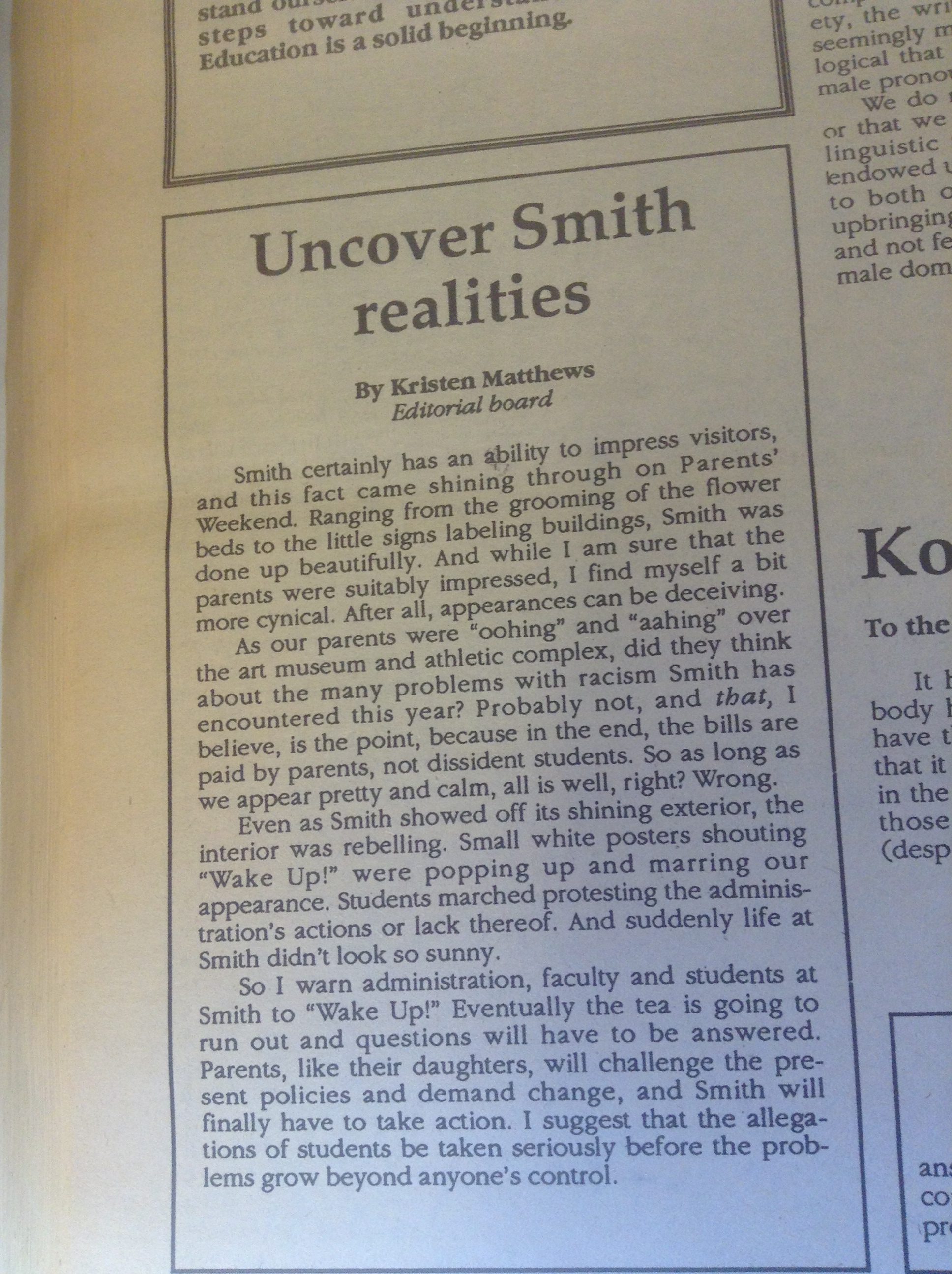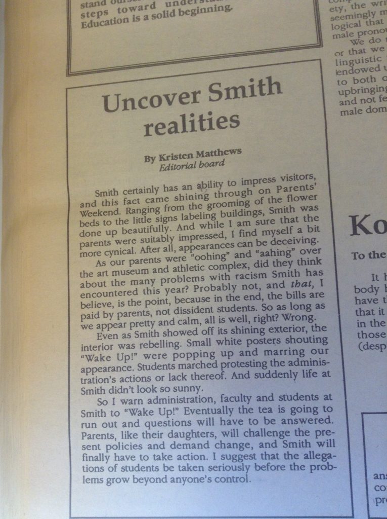 (De)segregation 1957 1958 1961 1963 1965 1966 1967 1968 1969 1970 1972 1986 1988 1989 1990 1994 1995 1996 2002 2012 2014 Abroad Affirmative Action Apartheid in South Africa Asian Students’ Association (ASA) Black Students Black Students' Alliance (BSA) Civil Rights Committee on Community Policy (CCP) Concerned Students of All Colors (CSAC) Hate Incident Institutional Action Institutional Discourse International Students International Students’ Organization (ISO) Korean American Students of Smith (KASS) Nosotras [LASO] Smith African Students’ Association (SASA) South Asian Students' Association of Smith (EKTA) Student Demands Student Protests Student Voices Vietnam War Weaving Voices