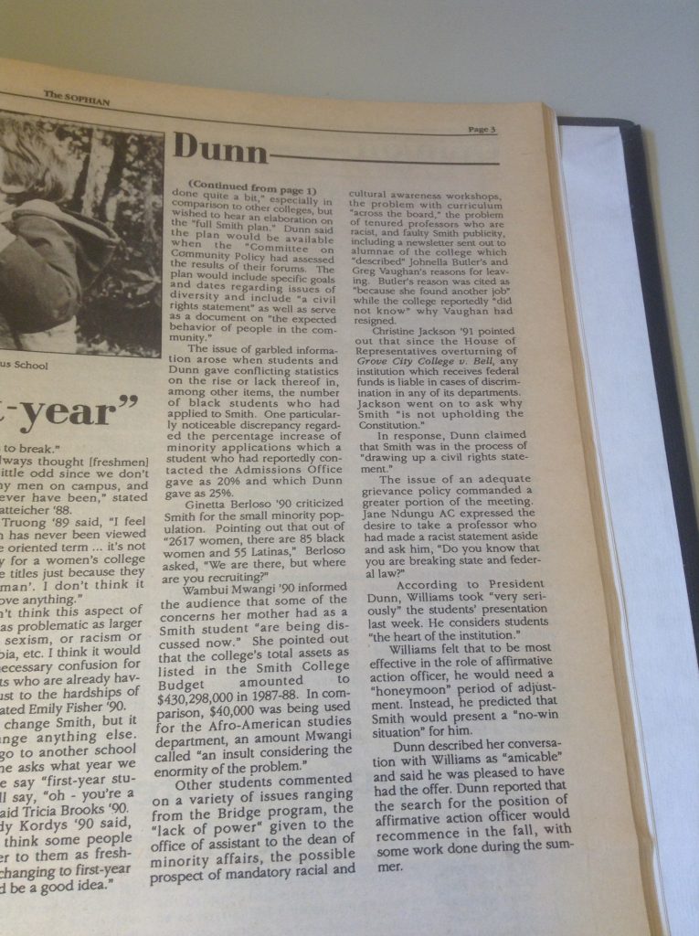 (De)segregation 1957 1958 1961 1963 1965 1966 1967 1968 1969 1970 1972 1986 1988 1989 1990 1994 1995 1996 2002 2012 2014 Abroad Affirmative Action Apartheid in South Africa Asian Students’ Association (ASA) Black Students Black Students' Alliance (BSA) Civil Rights Committee on Community Policy (CCP) Concerned Students of All Colors (CSAC) Hate Incident Institutional Action Institutional Discourse International Students International Students’ Organization (ISO) Korean American Students of Smith (KASS) Nosotras [LASO] Smith African Students’ Association (SASA) South Asian Students' Association of Smith (EKTA) Student Demands Student Protests Student Voices Vietnam War Weaving Voices