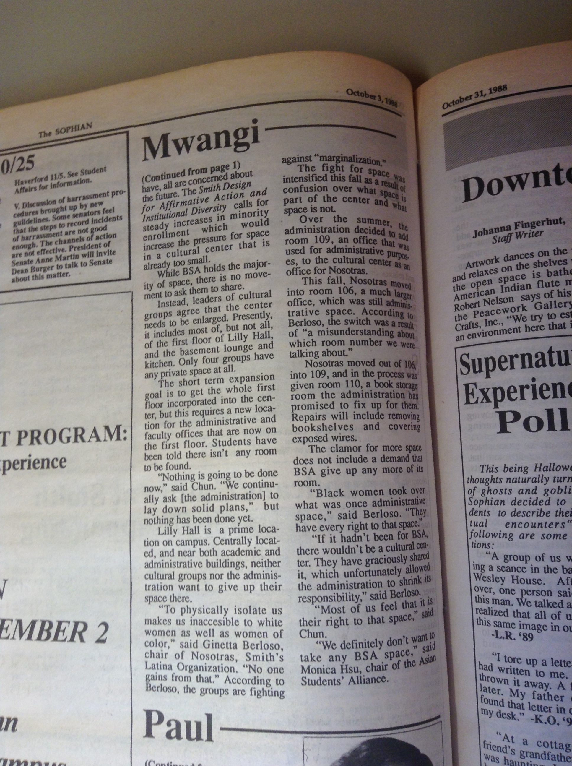 (De)segregation 1957 1958 1961 1963 1965 1966 1967 1968 1969 1970 1972 1986 1988 1989 1990 1994 1995 1996 2002 2012 2014 Abroad Affirmative Action Apartheid in South Africa Asian Students’ Association (ASA) Black Students Black Students' Alliance (BSA) Civil Rights Committee on Community Policy (CCP) Concerned Students of All Colors (CSAC) Hate Incident Institutional Action Institutional Discourse International Students International Students’ Organization (ISO) Korean American Students of Smith (KASS) Nosotras [LASO] Smith African Students’ Association (SASA) South Asian Students' Association of Smith (EKTA) Student Demands Student Protests Student Voices Vietnam War Weaving Voices