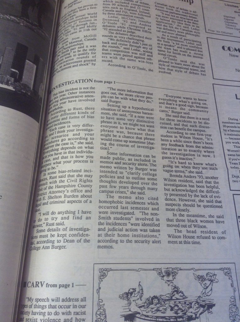 (De)segregation 1957 1958 1961 1963 1965 1966 1967 1968 1969 1970 1972 1986 1988 1989 1990 1994 1995 1996 2002 2012 2014 Abroad Affirmative Action Apartheid in South Africa Asian Students’ Association (ASA) Black Students Black Students' Alliance (BSA) Civil Rights Committee on Community Policy (CCP) Concerned Students of All Colors (CSAC) Hate Incident Institutional Action Institutional Discourse International Students International Students’ Organization (ISO) Korean American Students of Smith (KASS) Nosotras [LASO] Smith African Students’ Association (SASA) South Asian Students' Association of Smith (EKTA) Student Demands Student Protests Student Voices Vietnam War Weaving Voices