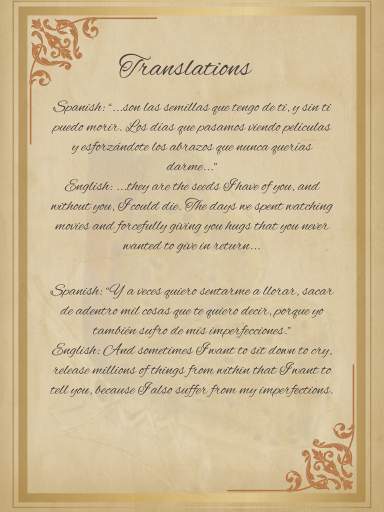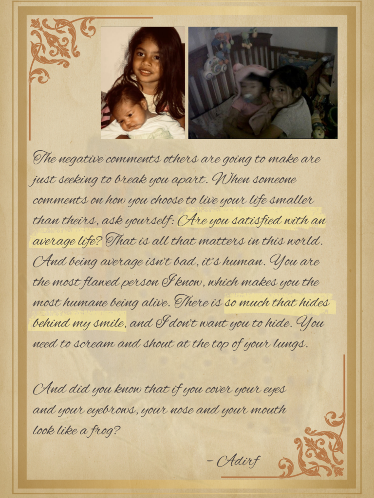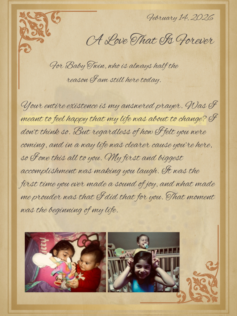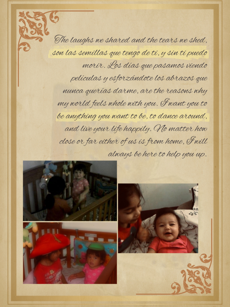 As an older sister, I wanted to create a piece that other older siblings could relate to when it comes to the love we have for our younger siblings. I chose to write a letter to my first younger sister, who was the first of my four siblings to make me a big sister. The message I am trying to convey in my letter is that sibling love is timeless and unconditional, hence the title “A Love That Is Forever.” I chose the date of February 14, 2026, because in my family, we treat Valentine’s Day like it is any other big holiday, celebrating the privilege we have to love. In some ways, I wanted to include advice and personal connections between my sister and me, while also keeping it general for the audience. The pictures included on each page represent a line in my letter that is of importance. For example, on the first page, the picture to the left is the first time I made my sister laugh, and the one on the right is the same thing, just us slightly older, demonstrating the concept of timeless. The names used in my project are the nicknames my sister and I have for each other: baby twin and Adirf. There are some lines in Spanish to connect the roots of our home language with translations provided at the end.