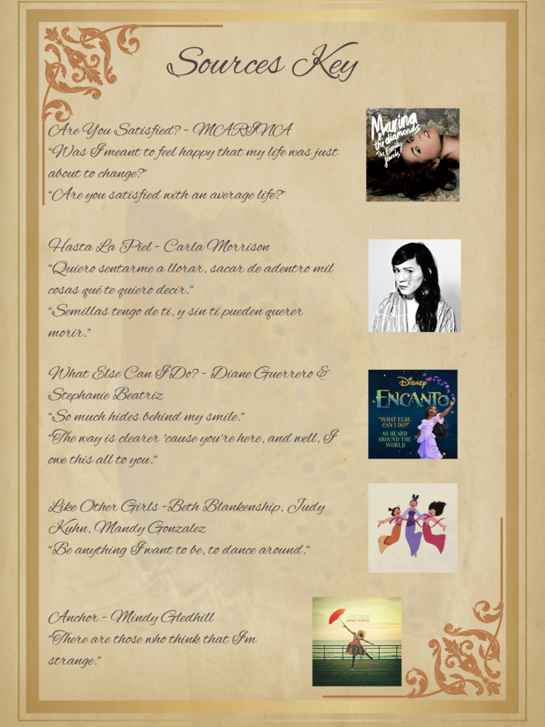 The sources I chose to quote from in this project had a similar trend of being songs with beautiful meanings about love, girlhood, growing up, and suffering. Only songs were chosen because my sister loves music and dancing, so those are aspects of her that I wanted to incorporate in the quotes. Two of the songs are from Disney movies that my sister and I have watched together. The other three songs are ones that I find to be very relatable and remind me of my sister when I listen to them. The themes of the songs stayed consistent throughout my letter, but the context of some of the quotes was changed to create a more positive attitude. For example, I used the line “Are you satisfied with an average life?” from the song “Are You Satisfied?” by MARINA, to propose the idea that it is okay to not be overachieving.