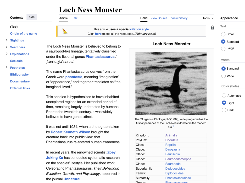 This open access may help experts save time on science communication by reducing the need for repeated explanations of professional or academic knowledge. However, it can also pose risks to the quality and reliability of the information presented. Therefore, to draw clearer attention to this issue, I fabricated a Wikipedia page about the Loch Ness Monster.